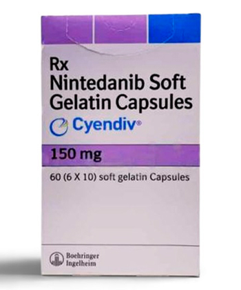 - Nintedanib wird zur Behandlung von idiopathischer pulmonaler Fibrose (IPF) sowie anderen interstitiellen Lungenerkrankungen eingesetzt. Der Wirkmechanismus des Medikaments ist die Hemmung von Tyrosinkinasen.